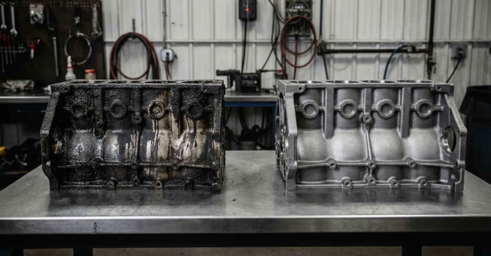 El Desafío: Mover piezas de 1.000 kg o más requiere infraestructuras seguras. El lavado por ultrasonidos suele ser insuficiente para suciedad "basta" y las cabinas baratas no soportan el peso estructural.